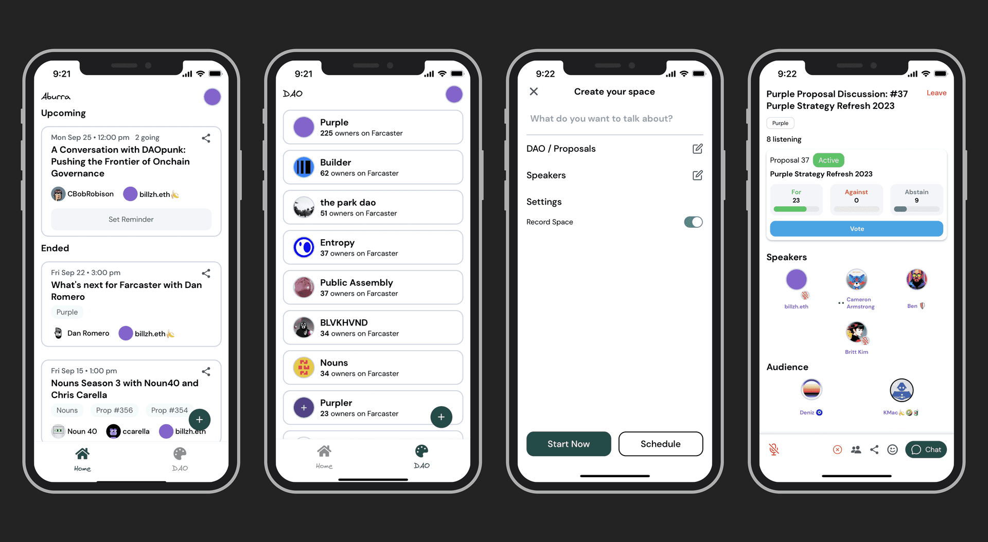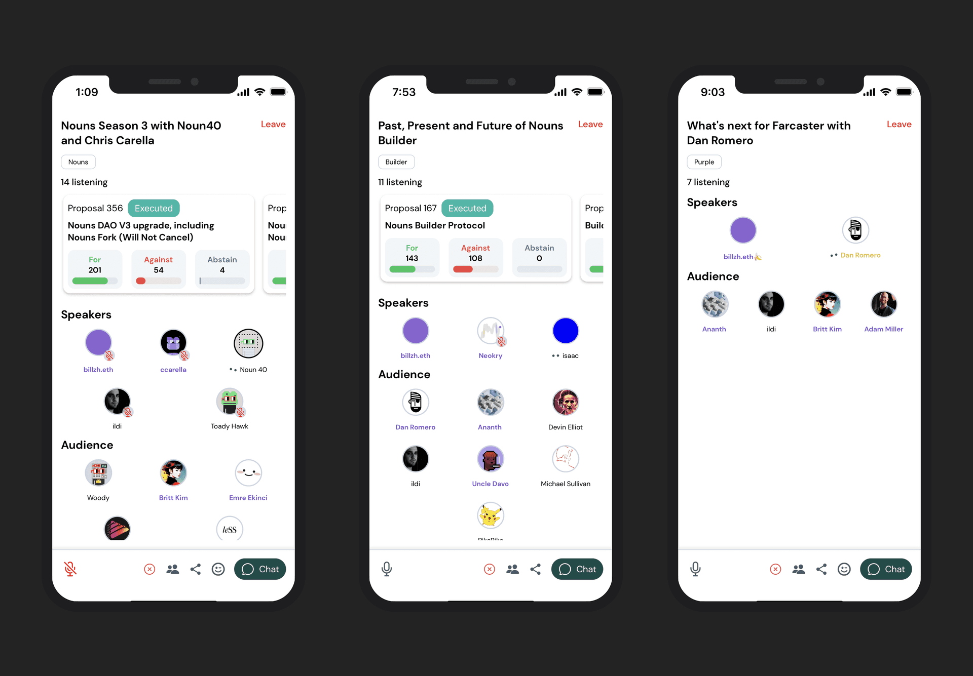 Today, Aburra has evolved significantly since its v1. In addition to being both a Nouns client and a Farcaster client, it allows anyone to host Farcaster spaces where listeners can directly vote for proposals.