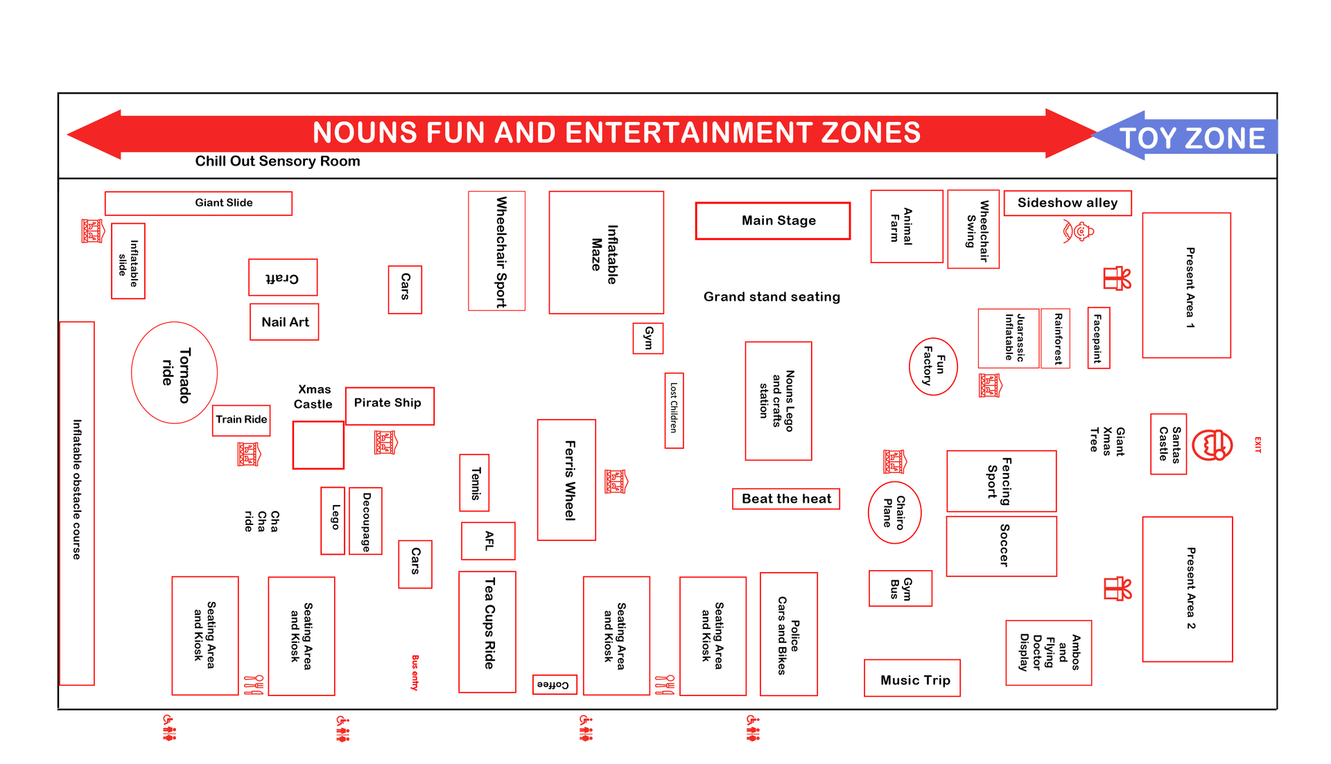 To elevate the 2023 Variety Kids Xmas Party, we propose the Nouns brand activations in synchronicity with the Variety red branding where Nouns bring the FUN and ENTERTAINMENT! These activations include a standalone Nouns Fun Zone with Nounish activities, branding across the venue and the Nouns Entertainment Zone (which cover 80% of the venue space) with dedicated Nouns branding. Deliverables include:
