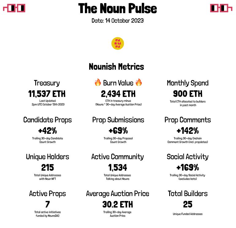 To begin, we will include onchain data available in the Nouns Subgraph and two social media channels: Farcaster and Instagram. We will publish a selection of core metrics that provide clarity to Noun holders and the wider community.