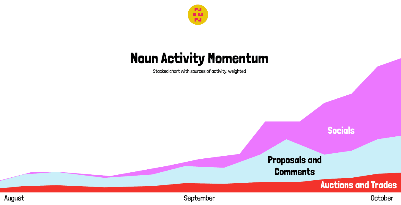 “Is Nouns activity growing?” “Who is helping increase engagement and spreading the meme?” “Which proposals are driving growth?” “What’s our spend rate?” “How many builders are contributing to the Nouns ecosystem?” “Are the amount of proposal candidates increasing?”