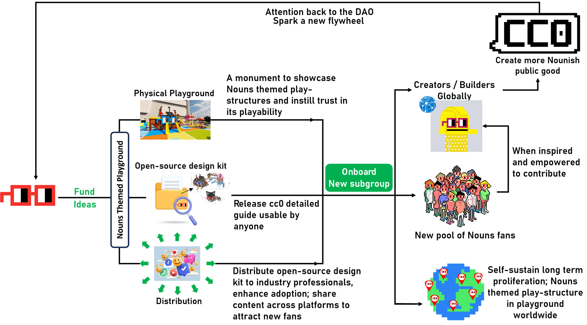 On top of the initial batch of play-structures, we will also identify additional 4 Nouns characters with the design team. These will also be created into play structures and release as part of our open-source design kit, to provide a more diverse range of play options which would help boost adoption.