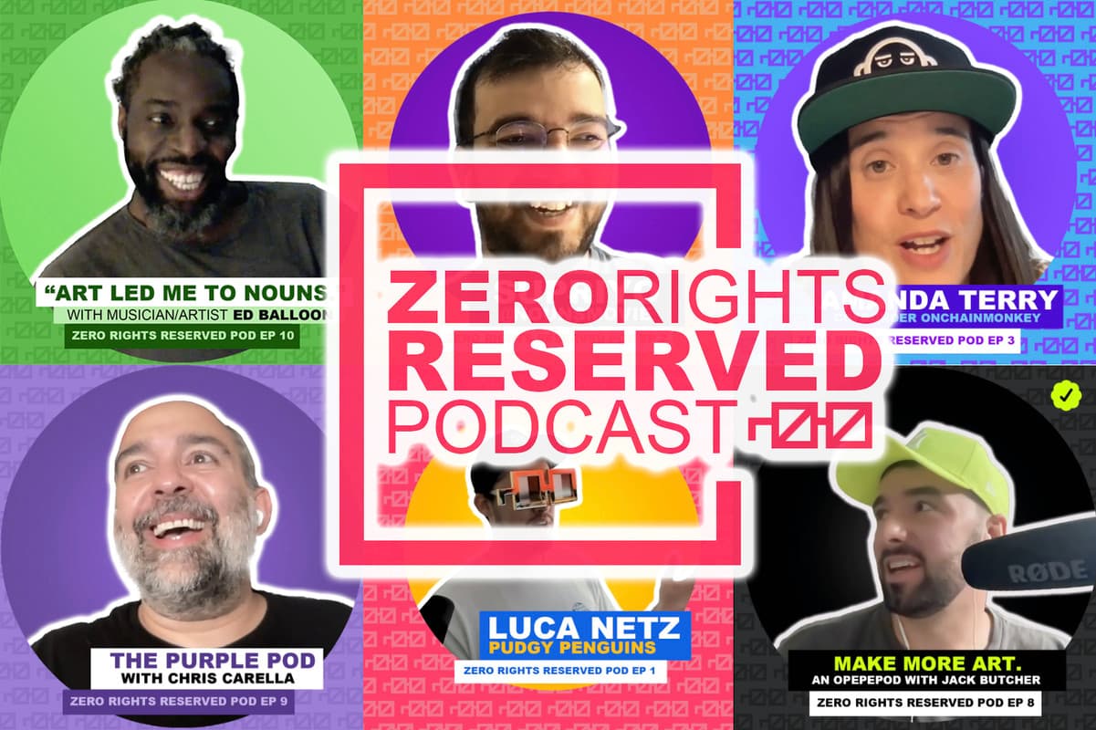 Zero Rights Reserved is a weekly video podcast that we launched in June as part of our renewed focus on creating more rich digital media. It is a podcast about Nouns, DAOs, Ethereum, Art and more, and our goal is to interview interesting guests from around the onchain space from a Nounish perspective, while entertaining and educating our audience and bridging gaps to other like-minded communities.