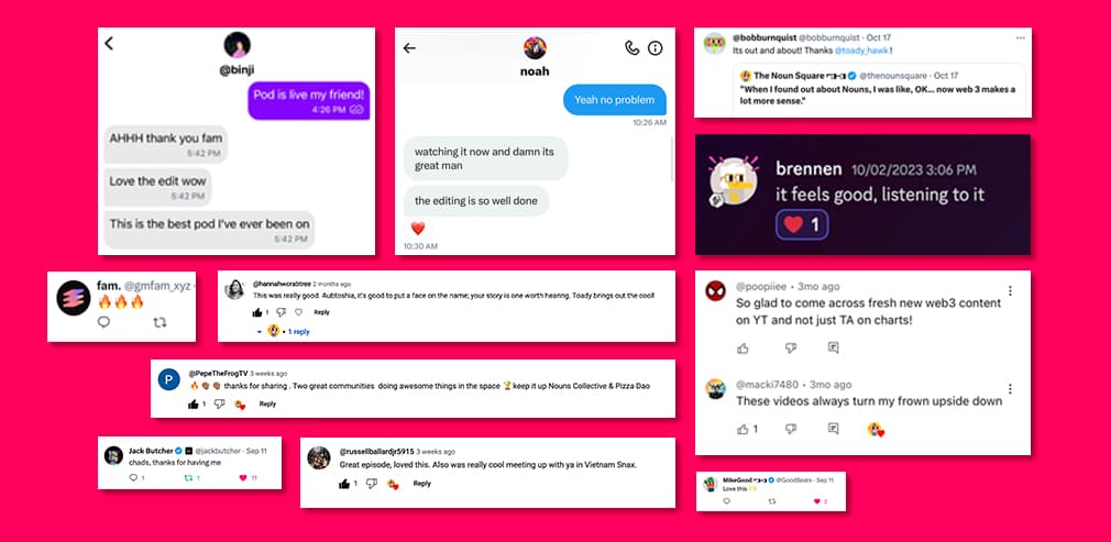 So far, the podcast has been getting very good feedback from listeners both inside and outside the nouns community, as well as from the guests that we have hosted so far: