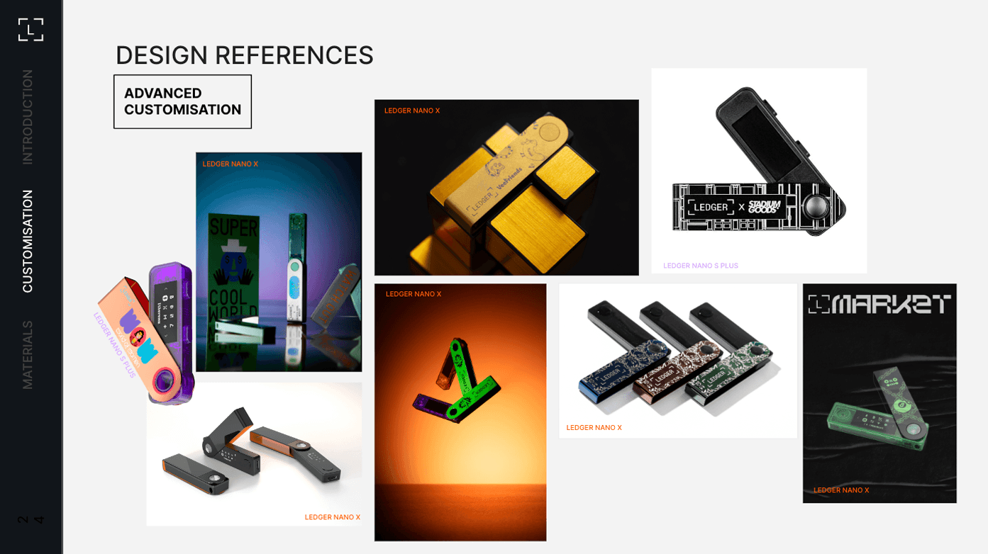 Ledger Nano S Plus will be the chosen model, as it has the best value and customization options. Not only will the device be fully customized, but also the full packaging, as shown below.