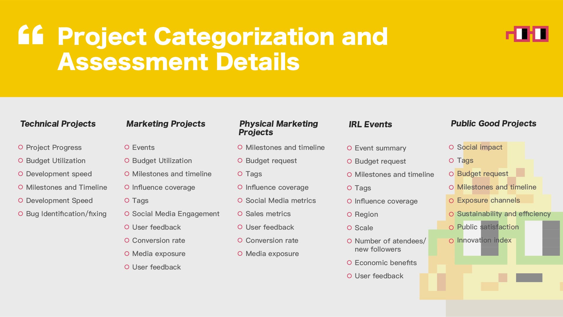 We have established a ‘Measurements Standard’ with specific criteria based on project types. This standard will serve as the foundation for our proposal analysis, ensuring consistency and transparency in our assessments.