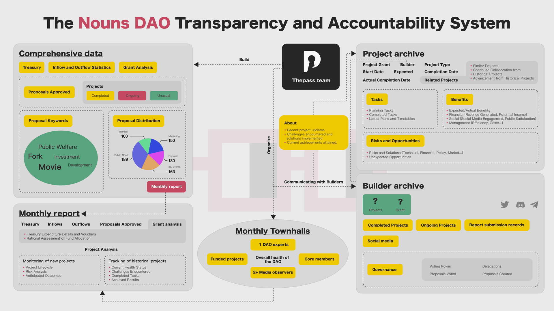 Even though we have many Nounish data dashboards and tools, we’ve realised that the tracking and evaluation process of funded proposals is not as efficient as it should. Additionally, solely relying on builders to submit reports voluntarily is not effective, leading to suboptimal results. What we lack is a bridge that fills the transparency gap between funded projects and the community.