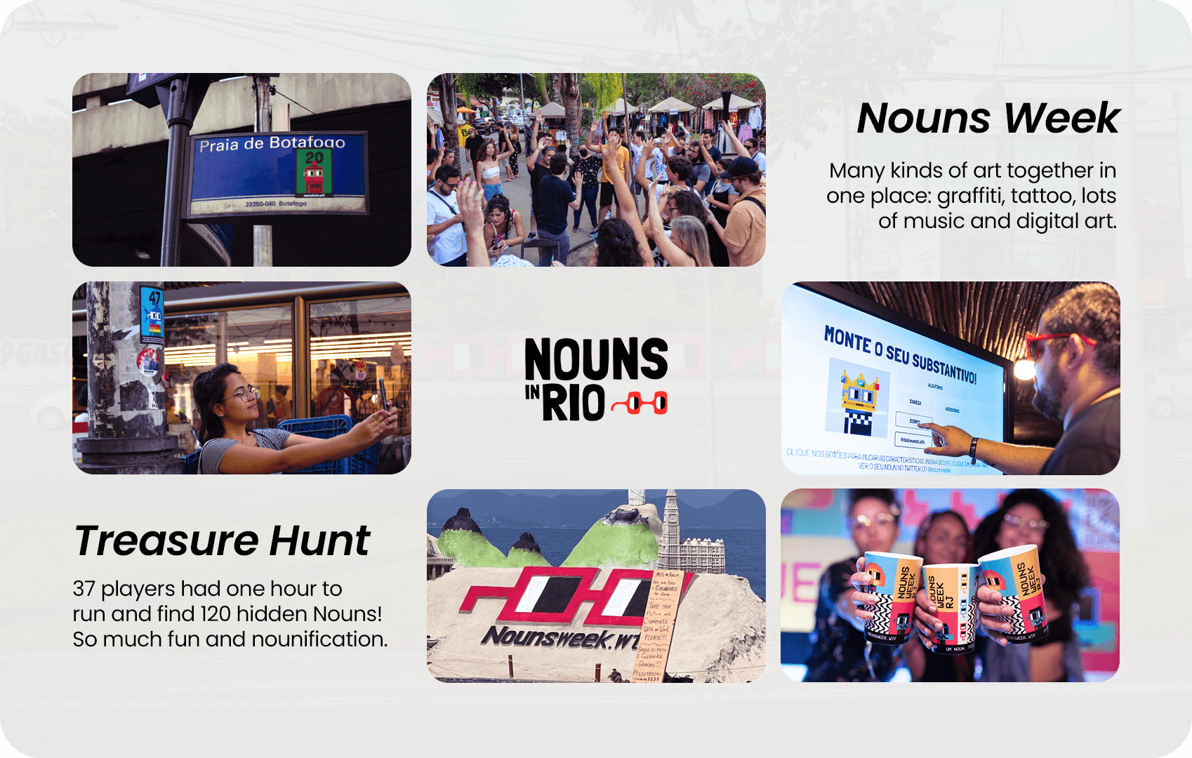 Nouns in Rio (represented by jp.⌐◨-◨ and Debinvest) - successfully organized various nounish IRL events, including Nouns Week, the Treasure Hunt, social actions for Prop House's Nounish Holidays and many others.