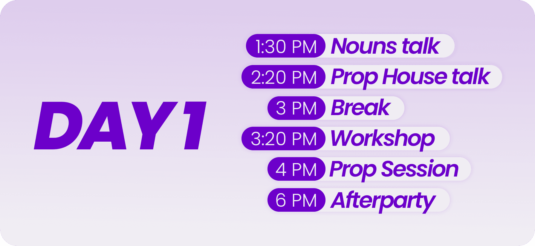 To tell the story of Prop House, we need to go back and explain Nouns first. So, the first talk will be about Nouns and how it's growing in Brazil. Then, we'll have a talk about Prop House and how it works. After a break, we’ll host a workshop on writing great proposals and share examples of successful ones.