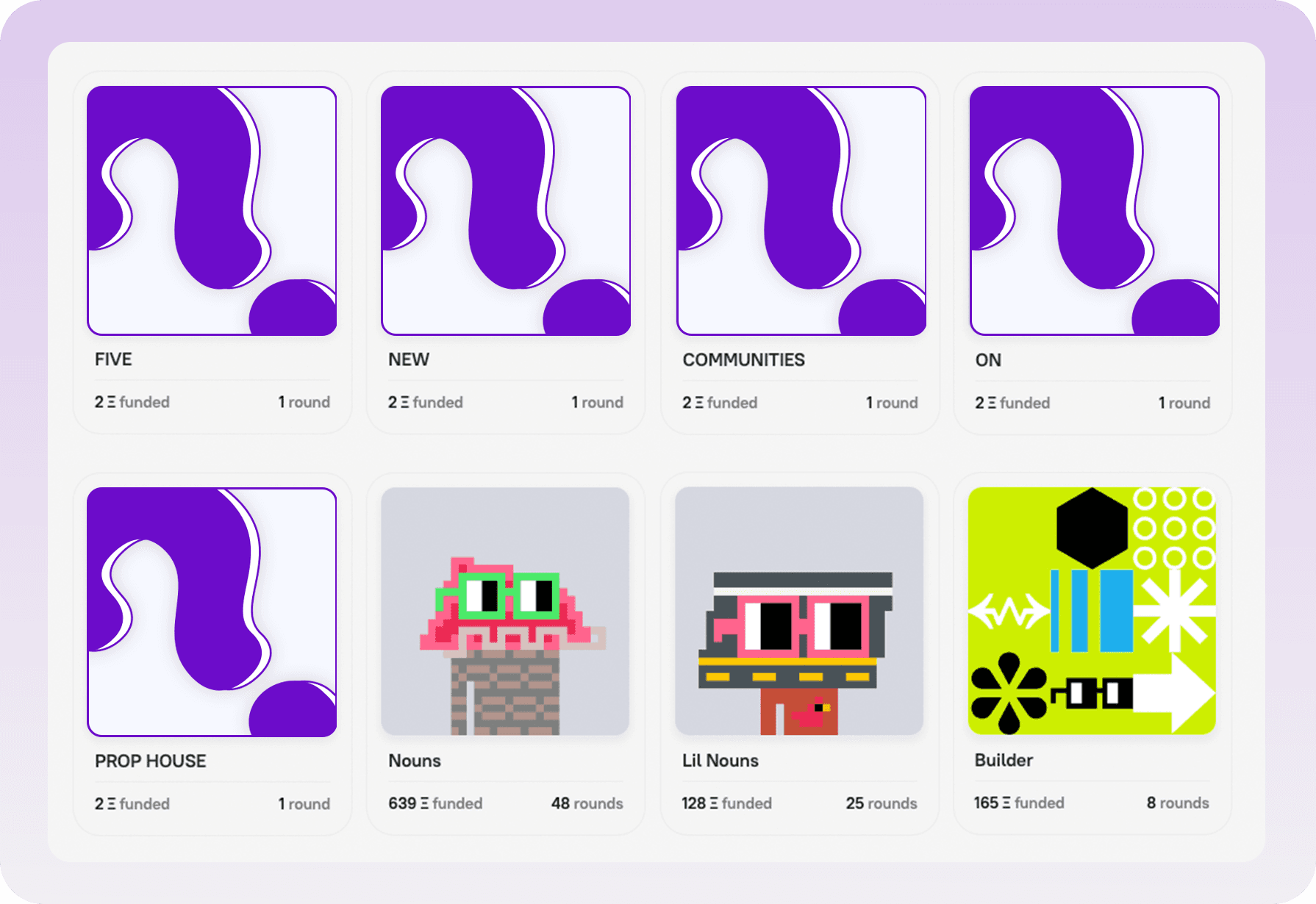 Prop House is a platform where communities can fund their builders, so we'll make this event community-focused. We'll allocate 2 ETH to each of 5 communities, with one essential rule: they must use it to establish their houses and conduct their own rounds on Prop House.