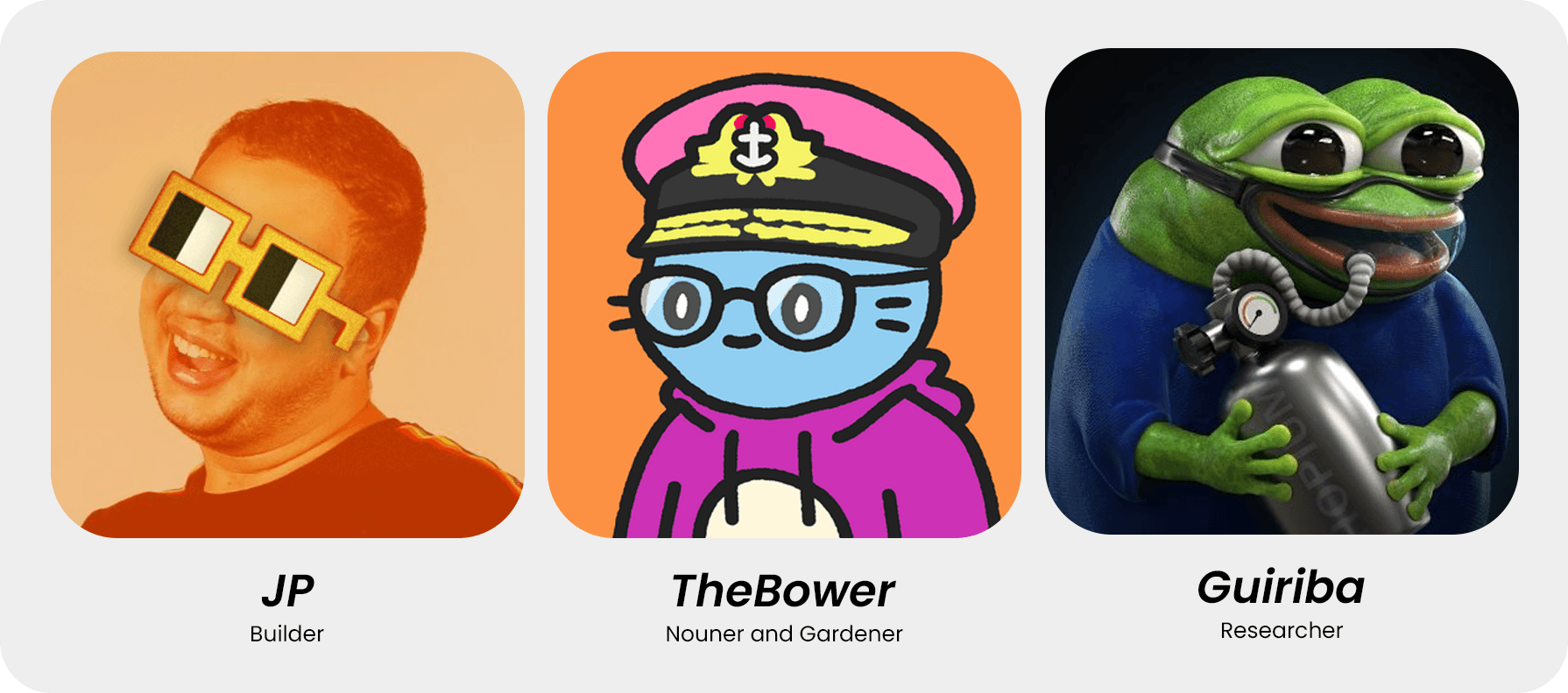 3 mentors will lead the workshop on how to write a good proposal and will be available to assist the teams during the Prop Session. JP has submitted dozens of proposals on Prop House, many of which have been approved. TheBower is a Nouner and a Gardener, having voted in many rounds. Guiriba is a researcher and has a lot to teach about governance.