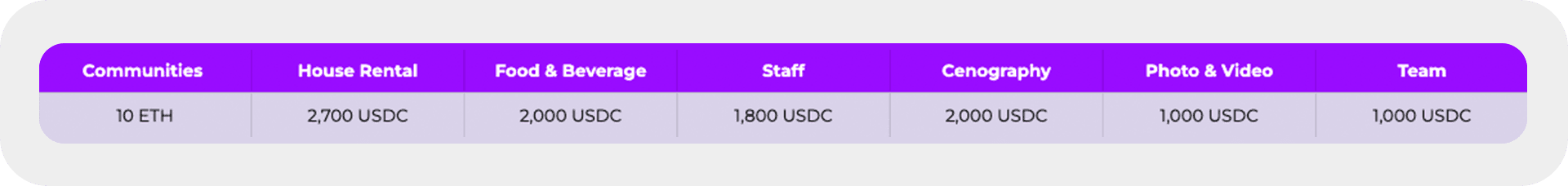 With 10 ETH, we aim to support 5 communities, thus benefiting numerous builders and a wide range of projects with significant ETH value. The total event cost, including team compensation, amounts to 10,500 USDC.