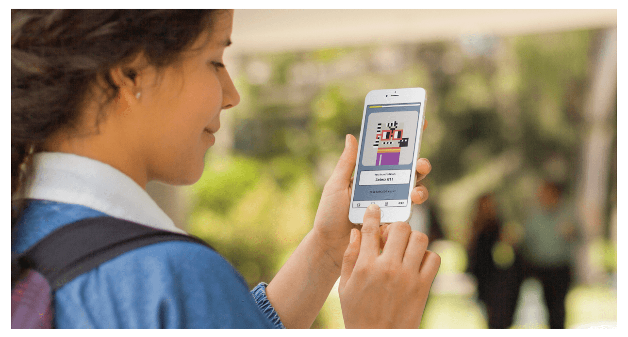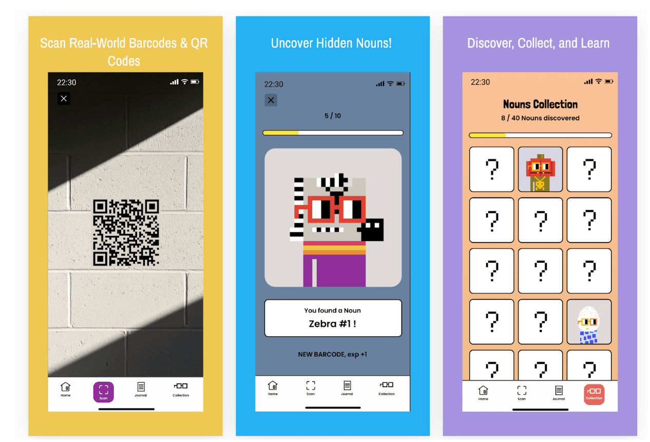 The Nouns Capture app allows anyone to find and collect Nouns hidden within barcodes/QR codes in their real environments. By scanning these barcodes using the app, students unlock the hidden Nouns and can store them in their digital journal.