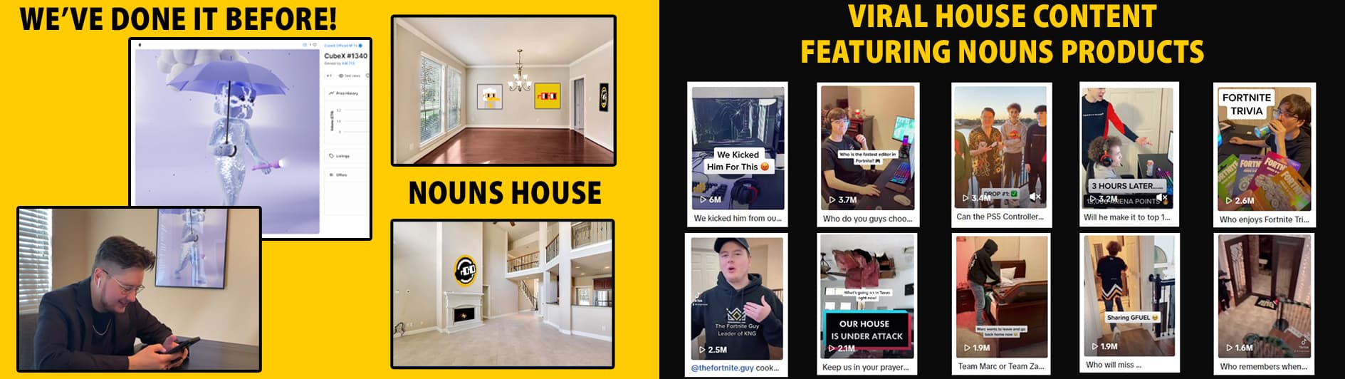 We operate a full-time gaming content house in Texas that has amassed hundreds of millions of views. We are prepared to execute a complete rebrand of the house, transitioning it from Kungarna and its sponsors to a fully immersive Nouns house. To get a feel for our gaming house check this video!