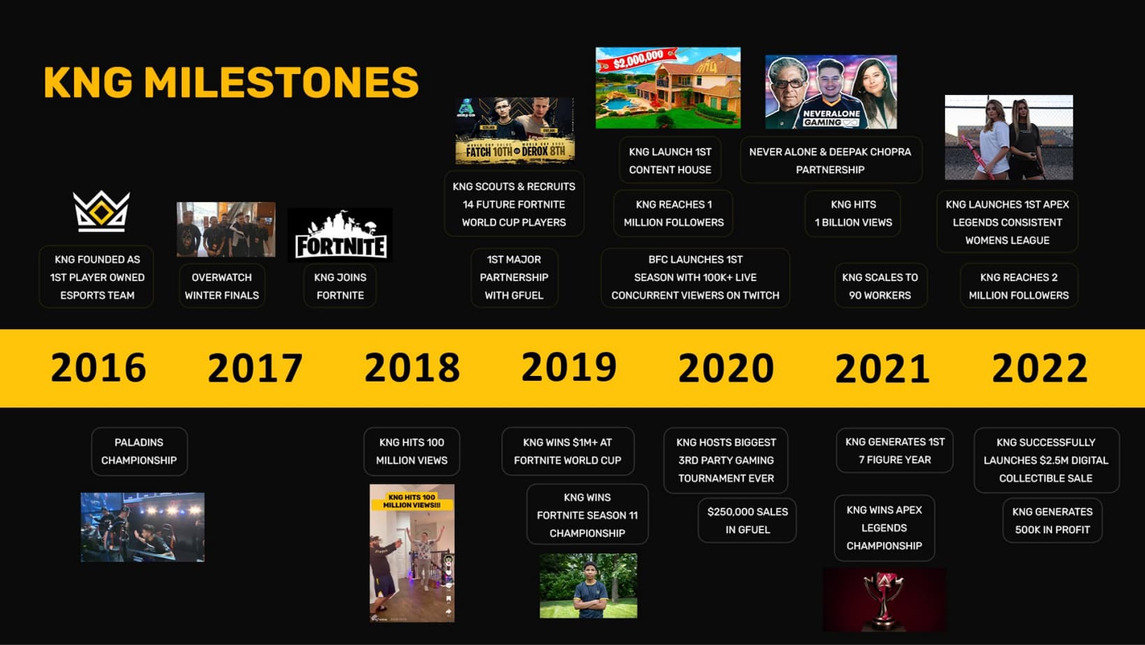 Established in 2016 by Michael "TFG" Padilla, KNG has achieved remarkable success collaborating with some of the most prominent streamers, YouTubers, and content creators worldwide. The Kungarna ecosystem achieved a staggering one billion views in 2022, a testament to its viral content and captivating creators.