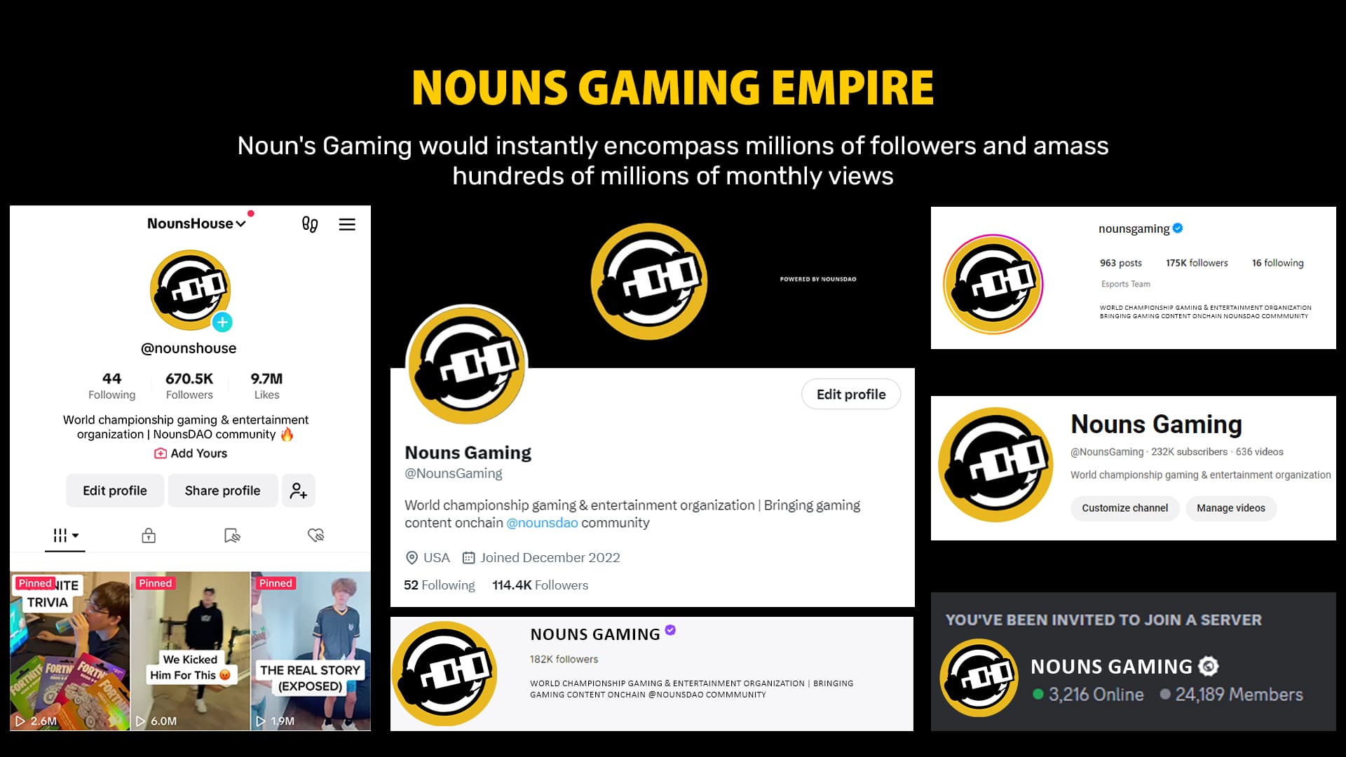 Our gamers are committed to fully embodying the Nouns identity and representing the brand across all social media platforms. Our projections indicate that Nouns Gaming will achieve a remarkable 5 billion impressions in 2024. This achievement will position Nouns Gaming as one of the most prominent and widely recognized brands not only within the gaming industry but also on a global scale.