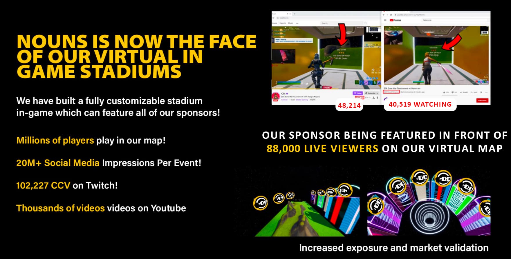 As part of our partnership with Nouns Gaming, we will rebrand all our events under the banner of Nouns Gaming. These events have consistently showcased the world's most renowned gamers, and been promoted by the likes of Clix, FaZe Sway, Tenz, Mongraal, ImperialHal, and many other gaming icons, who will now participate in the Nouns Gaming events.