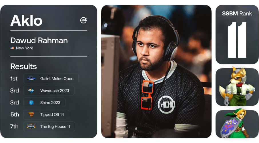 Meet our sponsored player Aklo, a rising star in the competitive Smash scene who now ranks among the top dozen on the global stage. Our relationship with Aklo has strengthened since we recruited him last year and his growing enthusiasm for our vision has motivated him to take on a greater role within the organization.