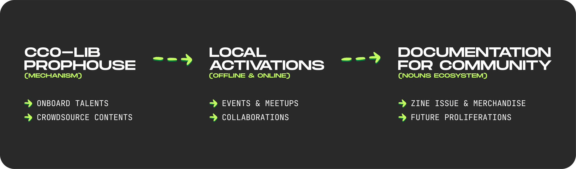 - we will invite and collaborate with a diverse of local artists, each representing various forms of artistic expression, to produce their own content about Nouns using resources from cc0-lib.wtf library