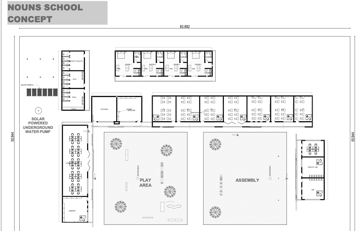 Description: Surveying of School land, Designing of Final Nounish Buildings, Construction material selection, cc0 modular Prototyping sustainable energy Technologies, Design and publishing of Replicatable Nouns School Model Framework.