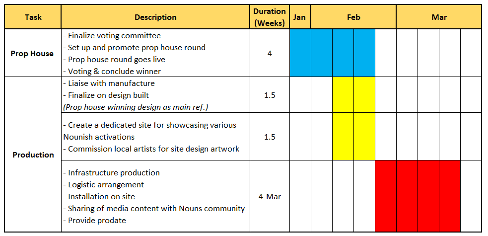 Additionally, we request 2ETH to host a prophouse round where community/artist/designer can participate and submit their nounish infrastructure ideas. Winning ideas will serve as primary ref. with manufacturer to then be created IRL.