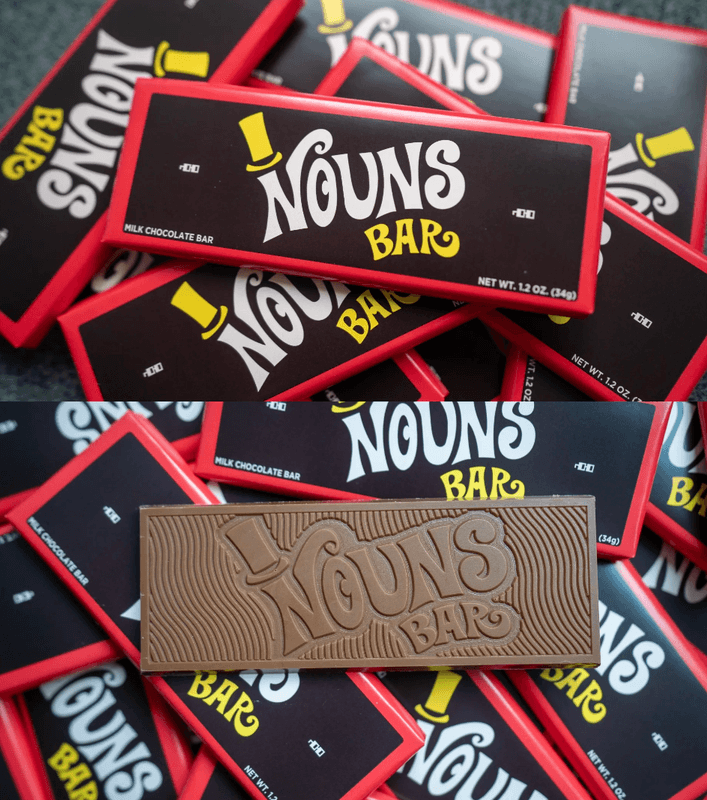 One of the most exciting products in the vending machine may not look like much-- a humble Nouns-branded chocolate bar. But like your mother always said, it's what's inside that counts. And inside each of these bars is a custom QR code where conference attendees can mint a free Nouns Chocolate bar NFT on Zora.