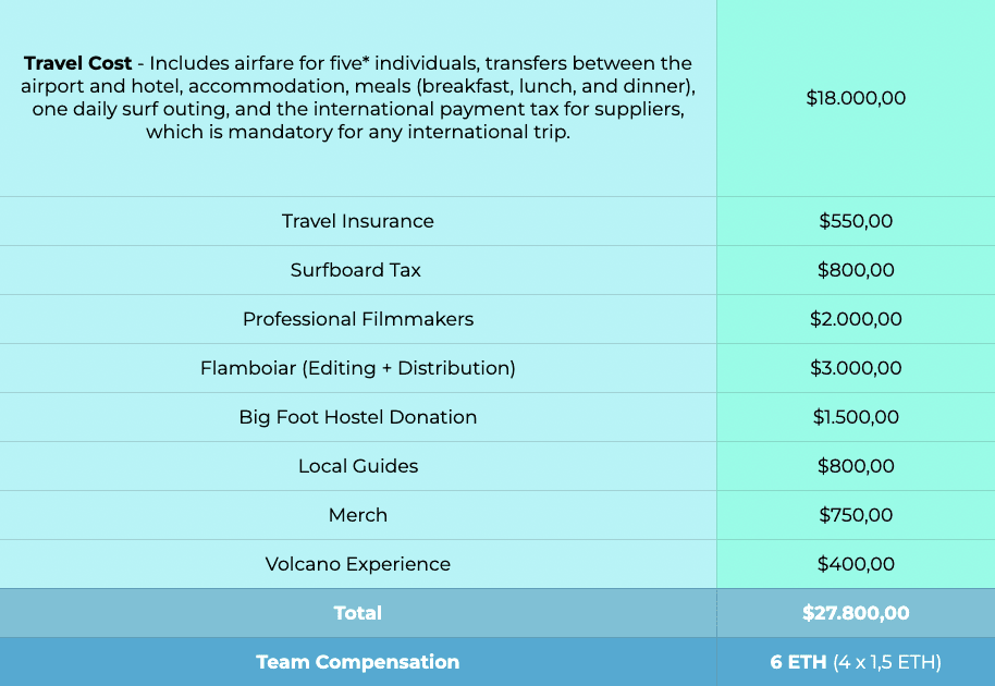 Both the Hostel and Volcano Boarding will be essential parts of the series, and given the beautiful and important work they do, we couldn't leave without showing our appreciation. That's why we'll allocate 1.5K USDC from our total budget to support their environmental initiatives, such as beach clean-ups, turtle rescue, and children's education - crucial local efforts that need to continue after we leave.