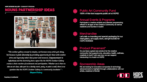 The HOPE Outdoor Gallery raised and invested $7.6 Million dollars to relocate this historic Austin art park and build a full-service events facility and Nouns has the unique opportunity to support the GRAND OPENING while also creating a permanent home for Nounish Culture in Austin, Texas!