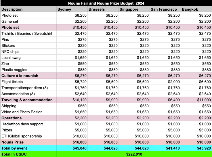 We are requesting $222,010 USDC to cover the Nouns Fair and Nouns Prize production costs + 90 ETH compensation for 9 months of work.