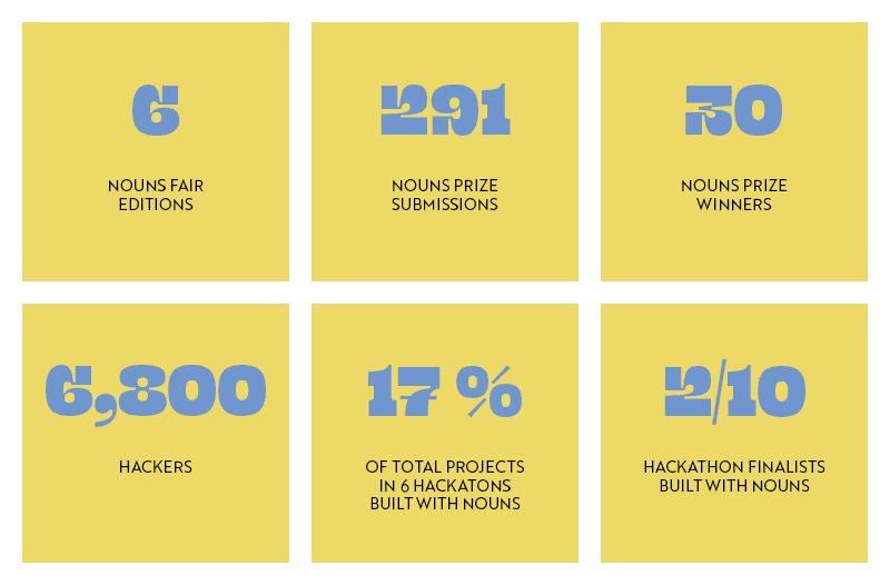 We introduced the Nouns Prize at those hackathons, and received 291 projects, representing 17% of the total submissions amongst 87 DAOs, protocols, and companies like the Ethereum Foundation, Uniswap Foundation, MakerDAO, ENS, Optimism, Arbitrum, Base, Polygon, Scroll, EAS, Aragon, The Graph, Lens, Safe, MetaMask, Wallet Connect, and many more.
