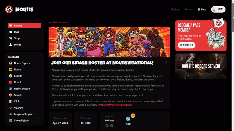 This year, we've successfully brought many Smash players and enthusiasts onchain through Prop House. From now until December, we will conduct four distinct voting rounds on nouns.gg engaging our community to shape the future of Nouns Esports:
