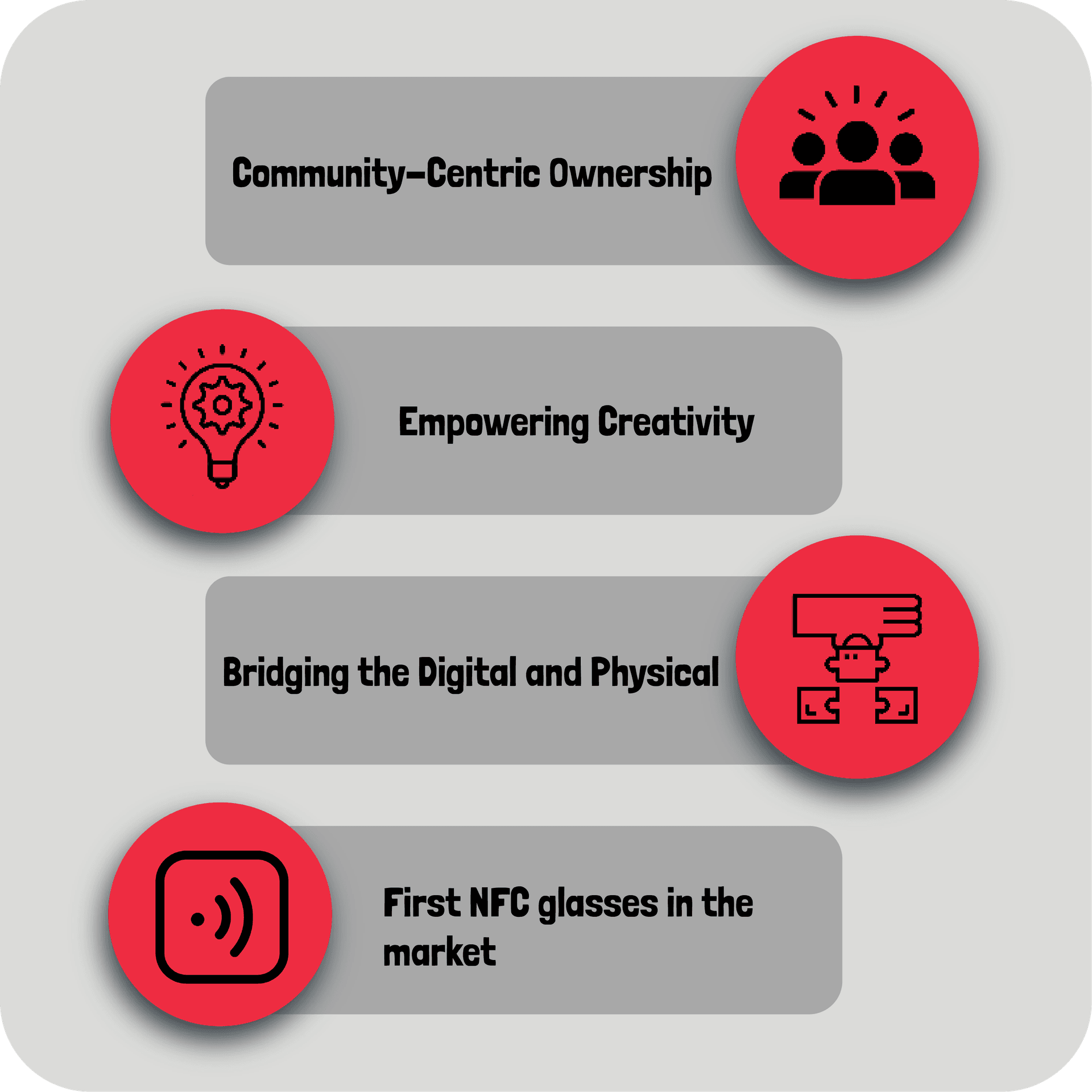 -Technology Integration: We are the first eyewear brand in the market to implement NFC technology directly into the temple of our glasses. This innovation provides numerous benefits to glasses owners. By simply tapping their glasses, users can access exclusive features such as pre-orders, voting on future collections, exclusive discounts, NFT acquisitions, card payments, and much more!