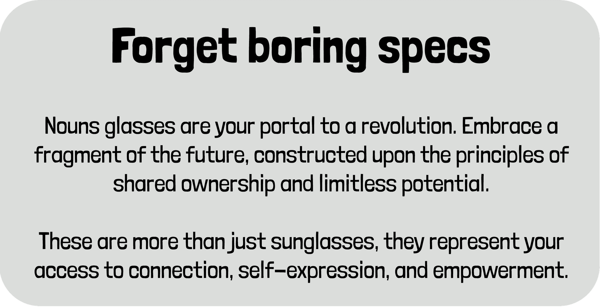 Interactive Campaigns: Encourage user-generated content with influencer-led challenges and contests featuring Nouns glasses. Leverage the power of user testimonials and reviews.
