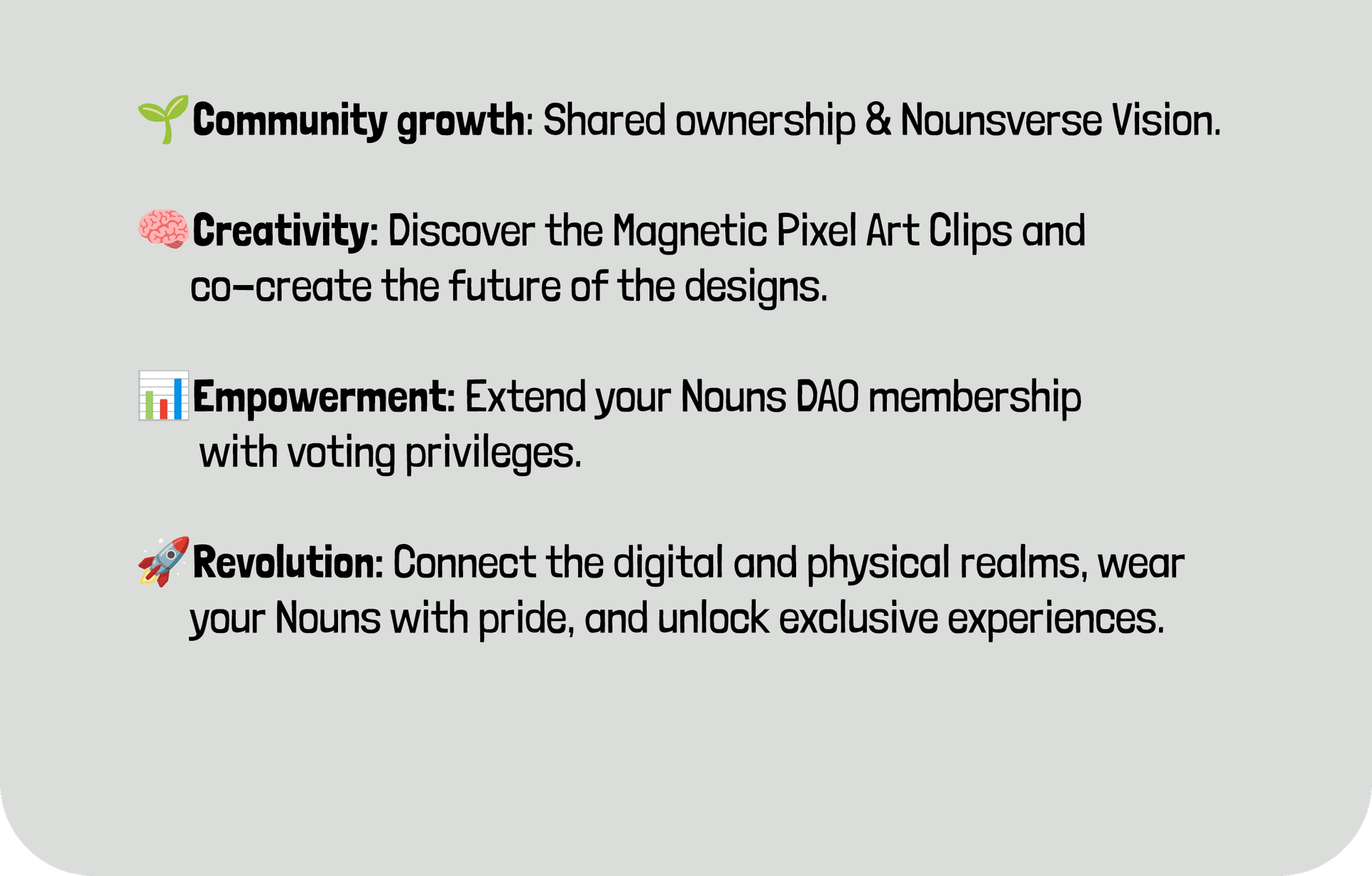 Decentralized Design Marketplace: Create a platform where Nouns DAO members and artists can submit and vote on new pixel art clip designs. Winning designs become part of the official collection.