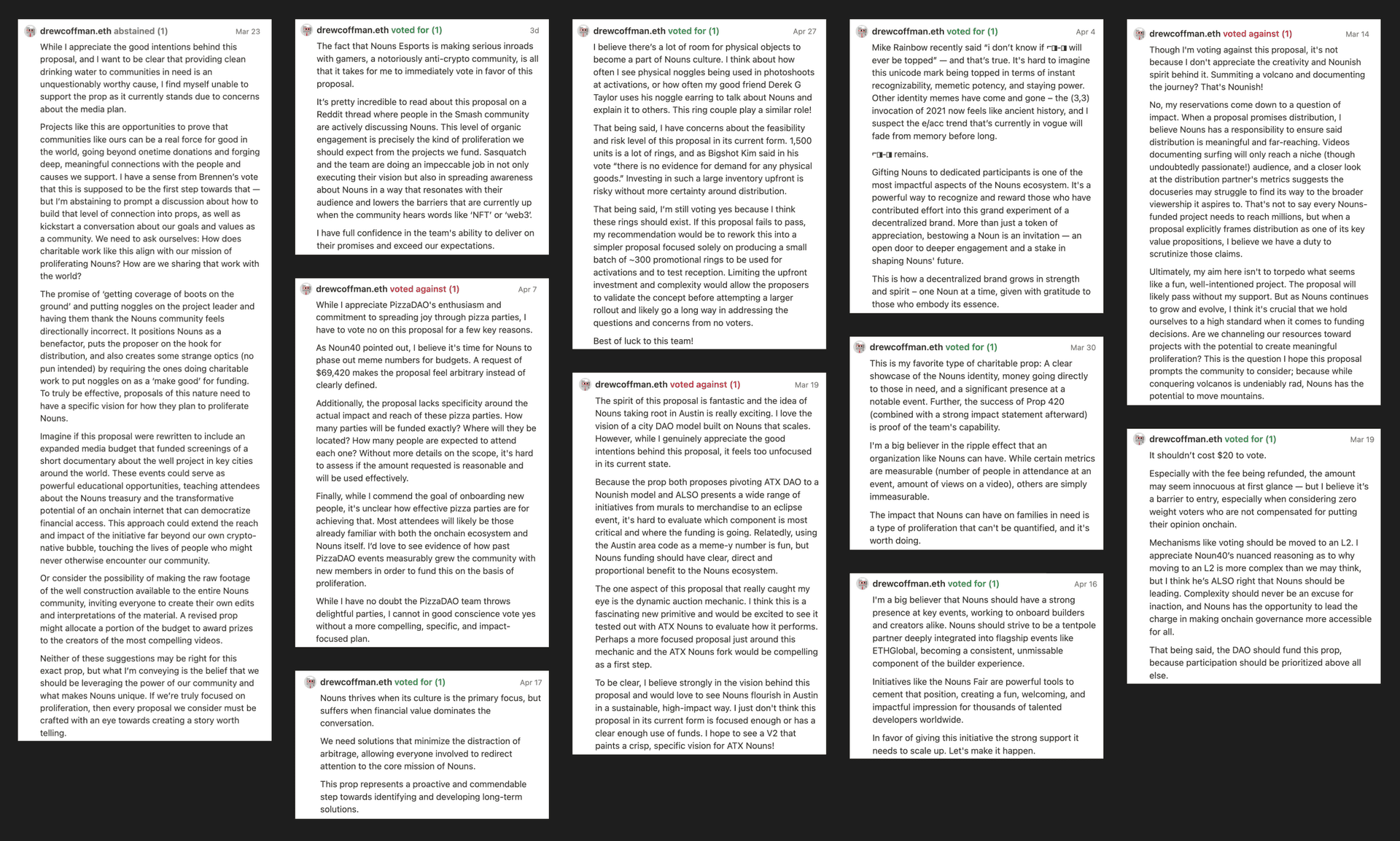 [1] I believe there are other voters who are worthy recipients of Nouns for their efforts in governance but gotta start somewhere, and Drew is the most recent example.
