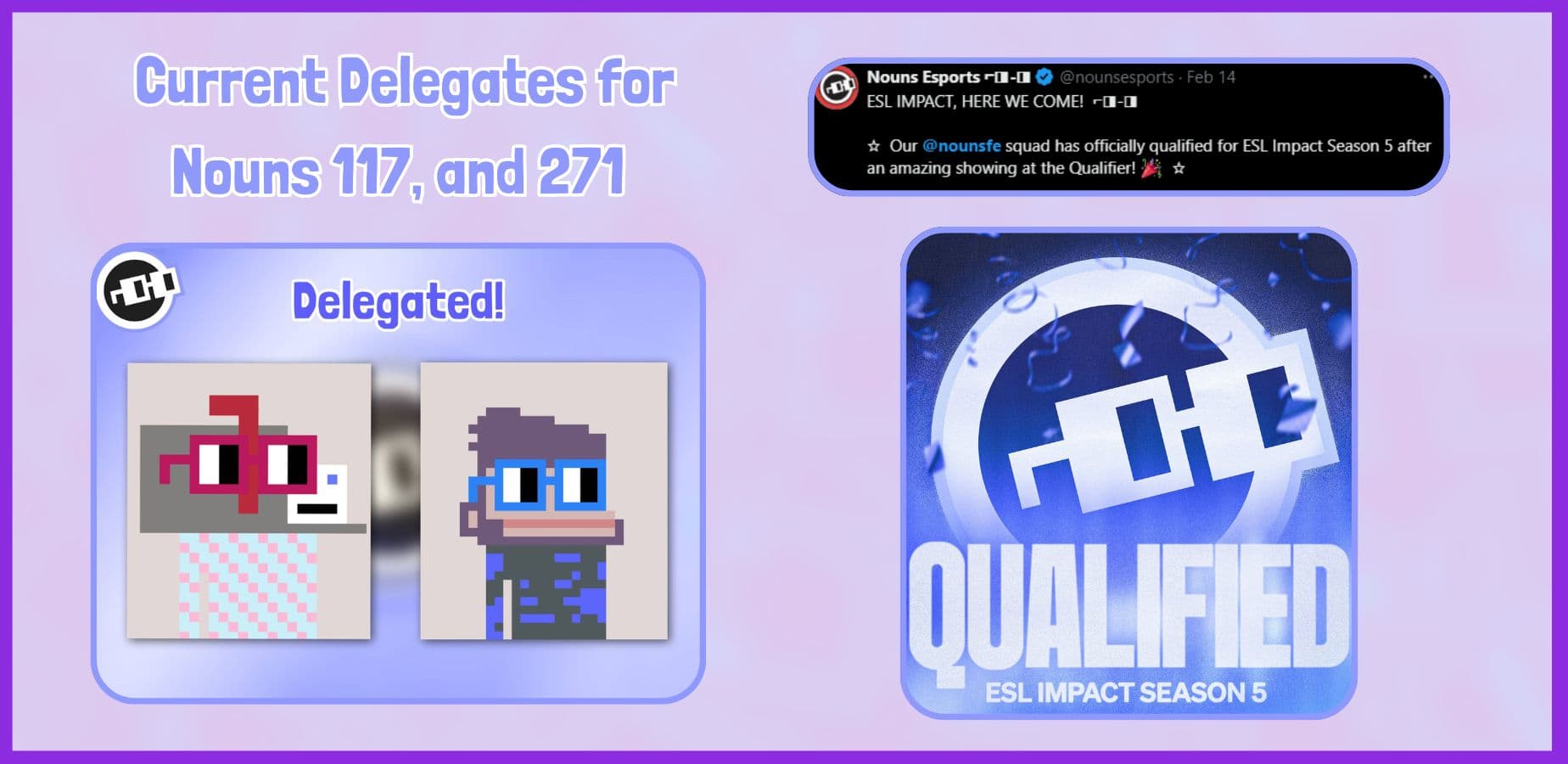 Now waving the Nouns flag in the women's esports scene, we qualified to ESL Impact Season 5. ESL Impact is the top professional league for women & marginalized genders. As one of our goals from our first prop, this was a huge milestone for us - accomplished through our hardwork as well as additional resources from Nouns Esports❣