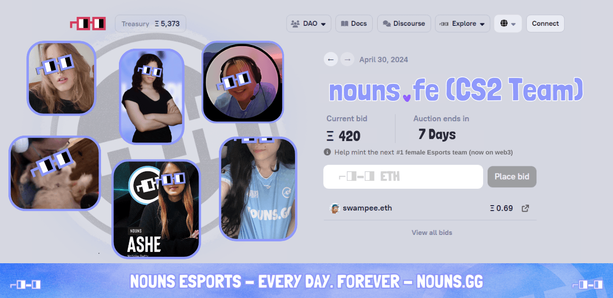 Through being great ambassadors in the scene, we will help write the next chapter of Nouns becoming a household name. In doing so, we hope to inspire other women into being competitors and creators in the gaming space as well. With the votes of some friendly neighborhood Nouns, we'll be able to constantly push for greater performance, while strengthening the personal bond between our audience, our players, and the DAO.
