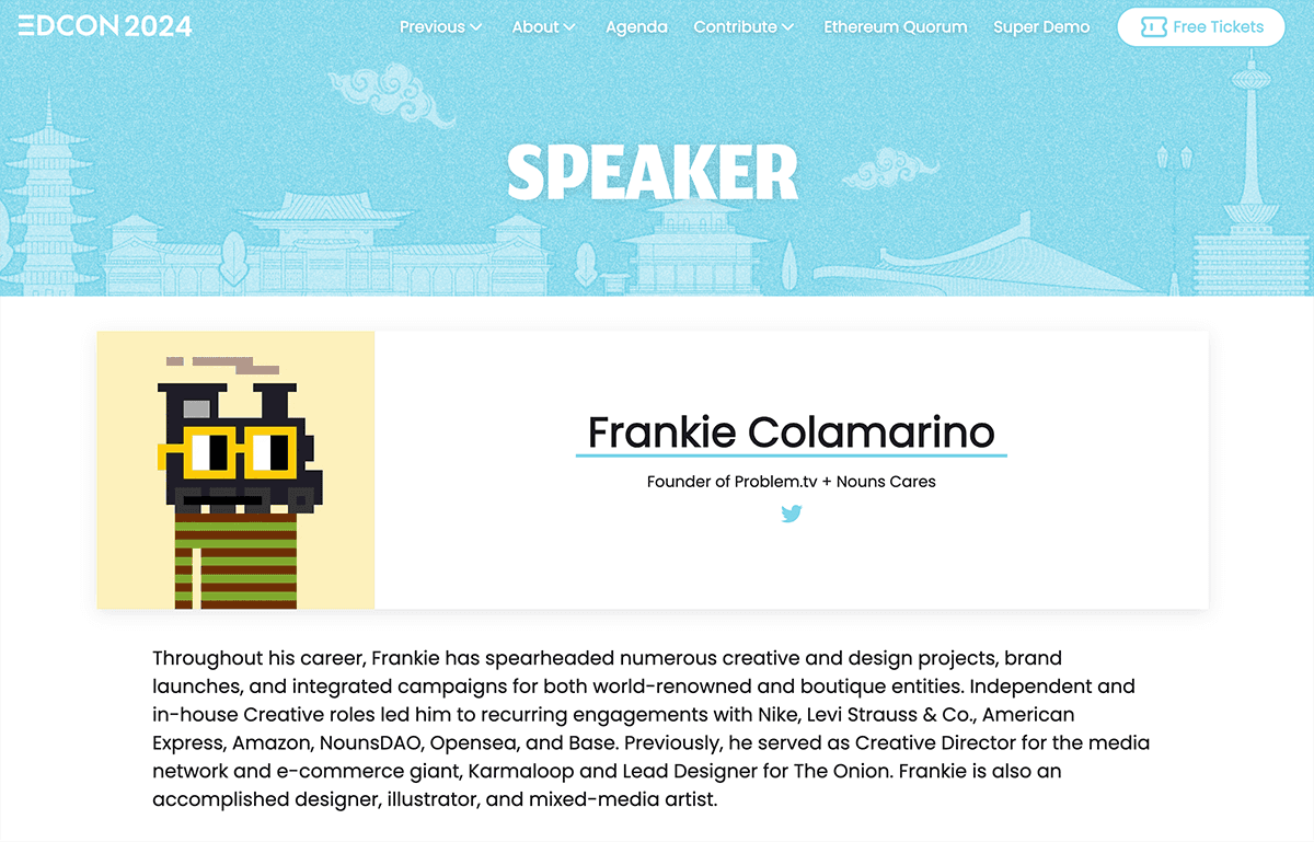 We'll also produce a special panel at EDCON hosted by key Nouns DAO contributor and member Chris Carella. The content and themes of this panel will be tailored directly to Chris' personal interest and history with DAOs, as well as his contributions and active involvement in Nouns.