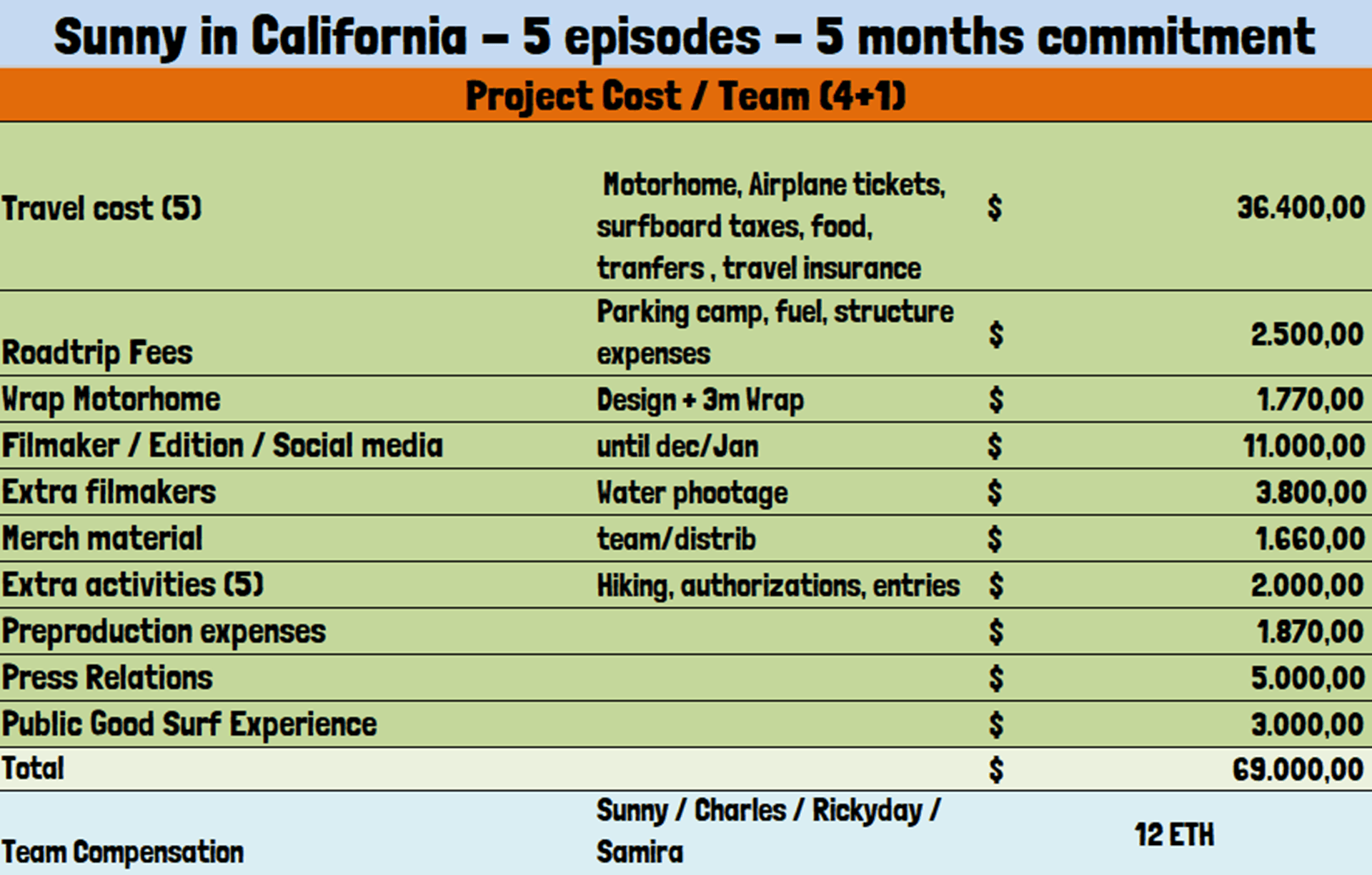 We are asking for $69k + 12 ETH to produce 5 episodes and 5 teasers over a 5-month full time commitment during a 23 days trip through California, delivering the episodes at the end of December/January.
