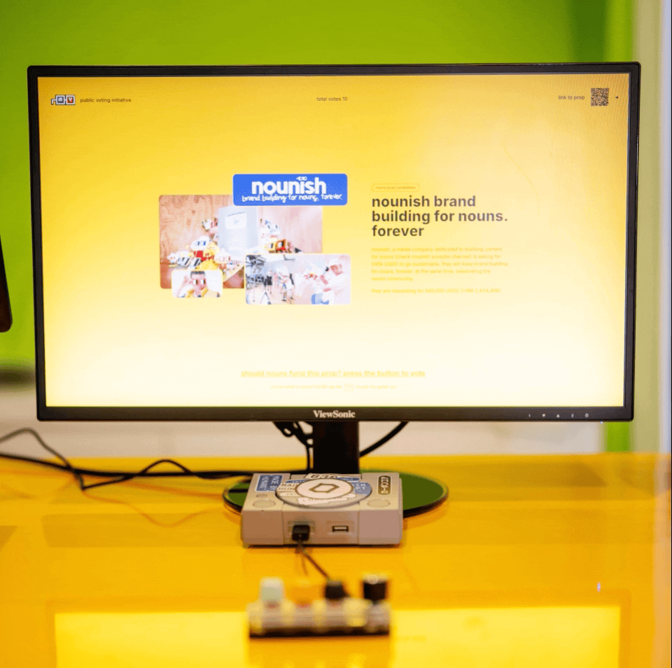 We have introduced a public governance voting installation during the grand opening where we can slowly educate public about how Nouns DAO governance system works. Public can cast their vote on Nouns proposal candidates. After getting some feedbacks & suggestions, moving forward, we want to enhance all past and future customers to be able to share their opinions & suggestions, and in return, they will receive extra perks at our physical store. We will also make it portable, enabling us to set up at various upcoming events.