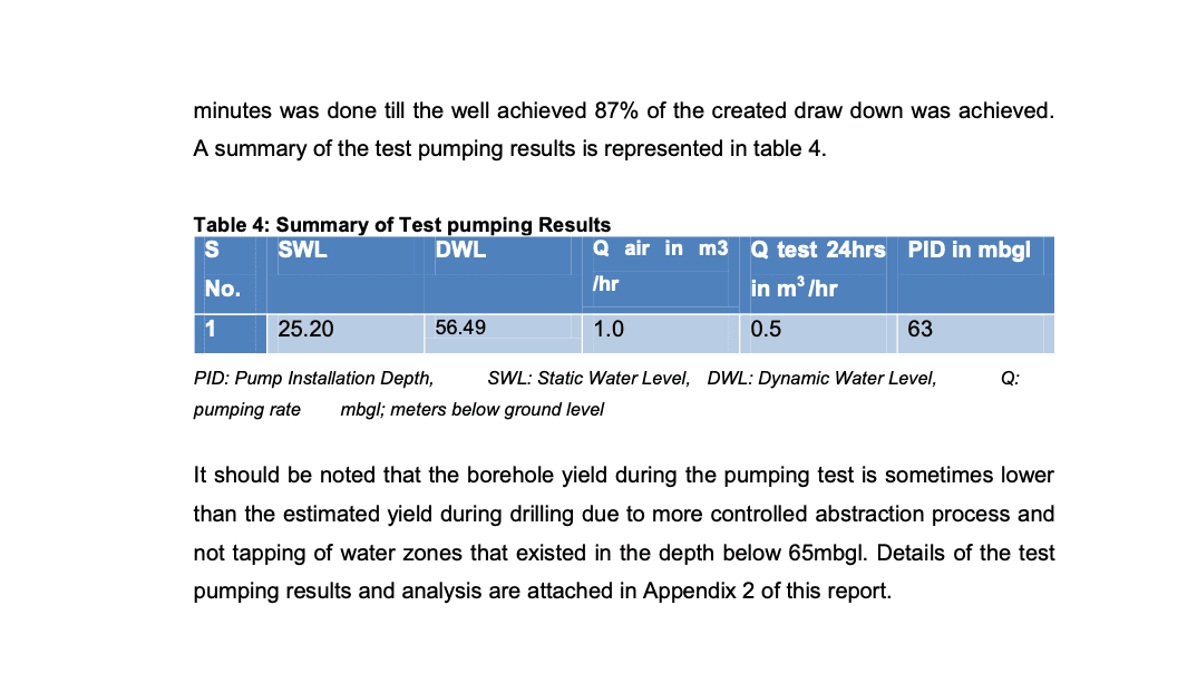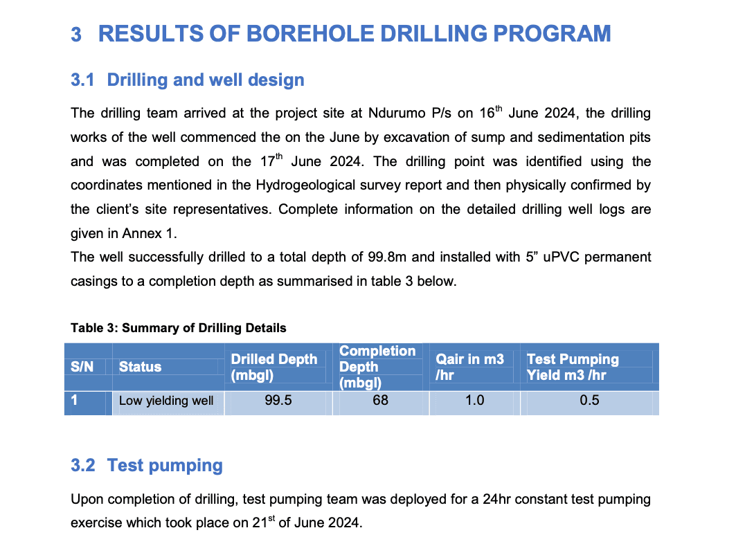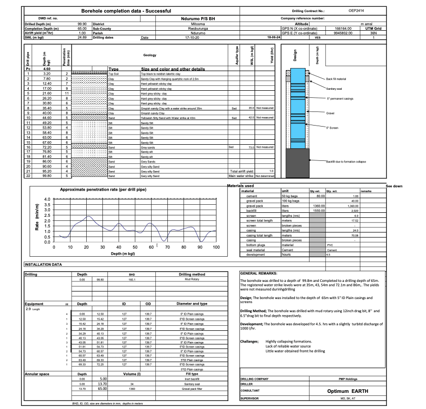 Drilling report by Optimum Earth is shown below and is pending presentation to the community for further consideration and way forward.
