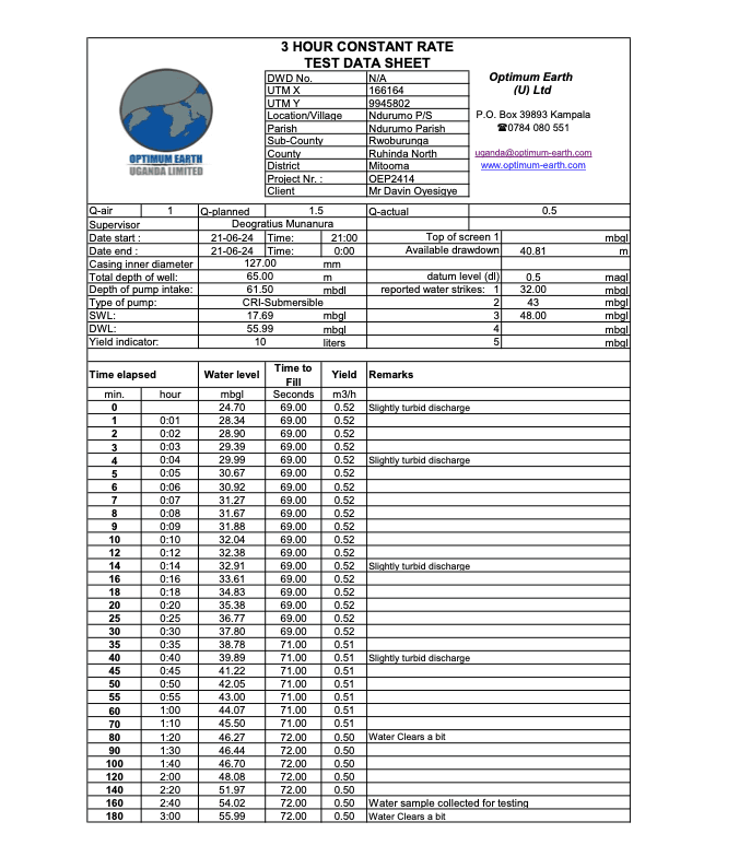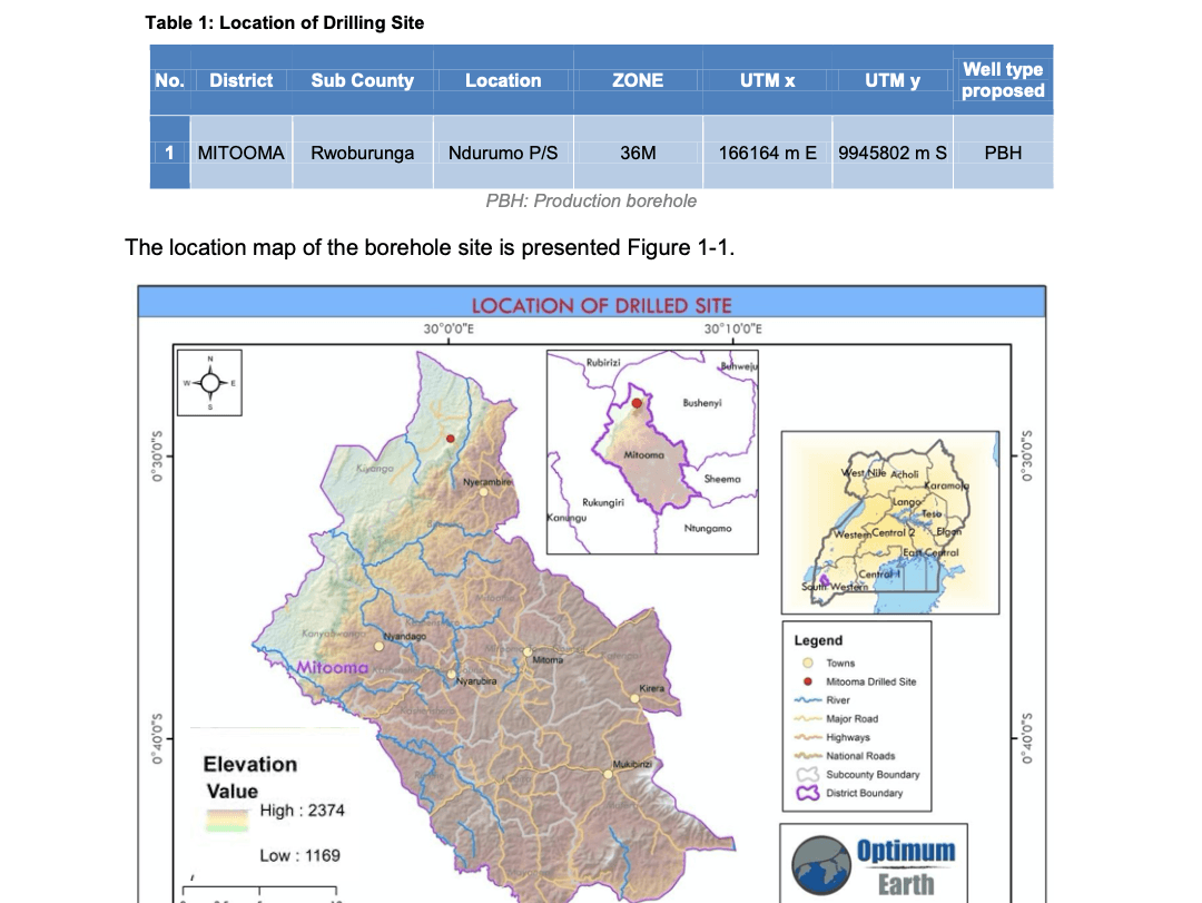 After the catastrophic failure of the first drilling attempt, we switched to support from Ministry of Water and Environment, Uganda coordinators who suggested a more trusted water drilling supplier Named OPTIMUM EARTH (U) LTD who was able to take the earlier collected Water Survey Data of a 100m water reservoir well and was only able to secure only 500 ltrs per hr instead of the agreed 5000 ltrs per hour hybrid motorised community water well