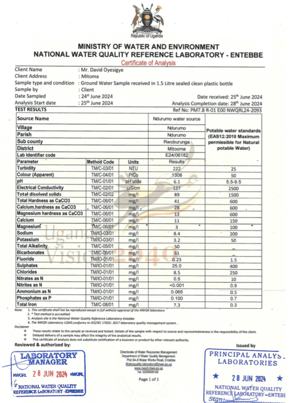 NB: The newly drilled well was not "humanely potable drinking water" - directed by Ministry Of Water and Mineral Development consultancy for community consumption because the well drilled has an Iron (Fe) concentration of 7.3mg/l which is over 95 % above the acceptable drinking potable water fit for human consumption by Ministry of Water and Environment, we were advised to abandon well due to the negligence of the 3rd party drilling company losing over 30m of well due to the soft formation collapse that was experienced during the drilling operation which lasted only 2 days.