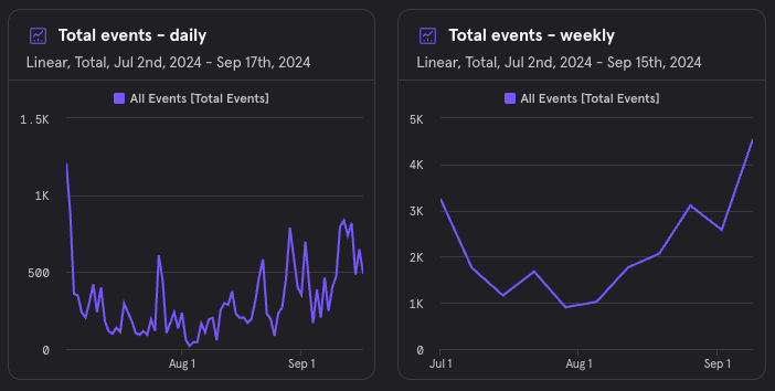 The most exciting metric is the total events. This chart gives an overview on how much users are using nounspace collectively across all tracked events, including signing up, editing their space or homebase, liking or casting, or viewing a page. nounspace has seen double digit week-over-week growth for 5/6 weeks (wowowowow), with over 500% increase over the past 6 weeks.