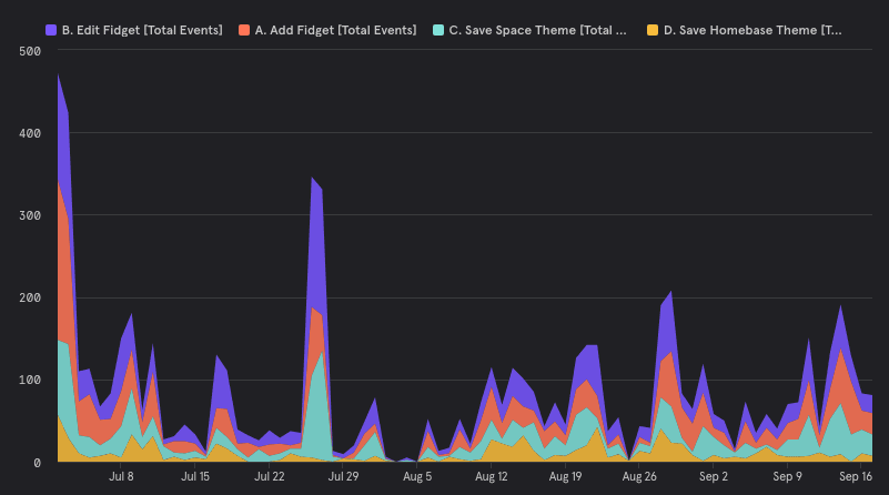 After a rapid fall from an exciting peak at launch, activity from users customizing their space literally hit rock bottom at the end of July. Since then, we've seen users customizing their Space and Homebase daily.