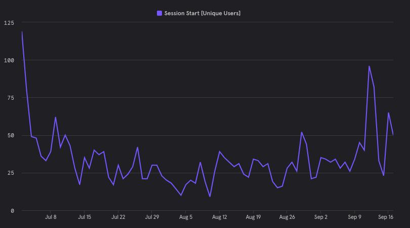 Visits peaked on the day nounspace launched, in large part due to the pent up hype we'd been building over the prior 3 months. Unfortunately, our young private alpha was not quite ready to go viral, and our usage declined over the following month. Since the beginning of August, we've seen visitors steadily increase as we continue building and addressing feedback.