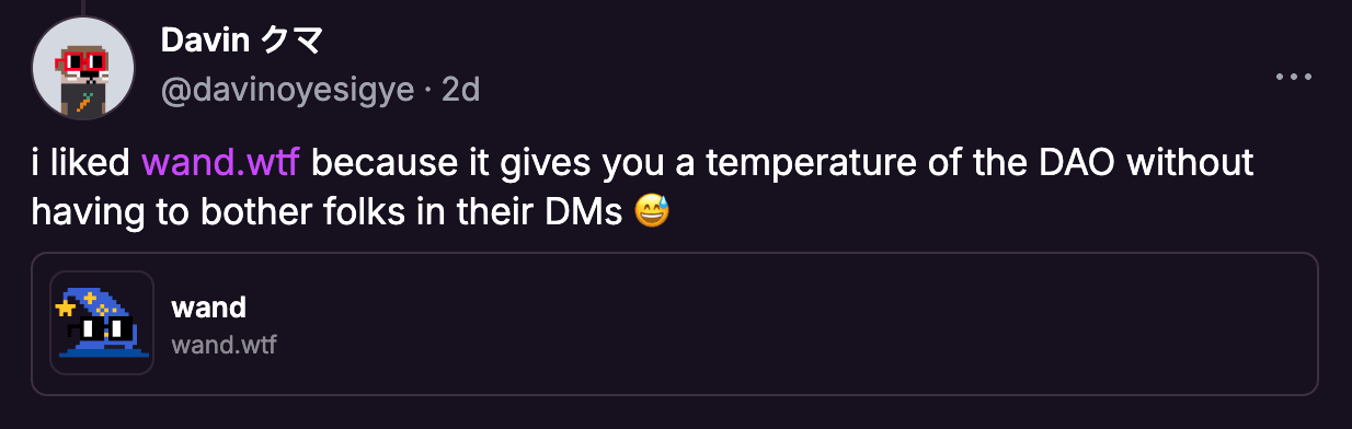 Improving the accuracy of these vote predictions is a major priority for Wand's development. I expect them to become the foundation of new governance behaviors in the future, such as assisted voting.