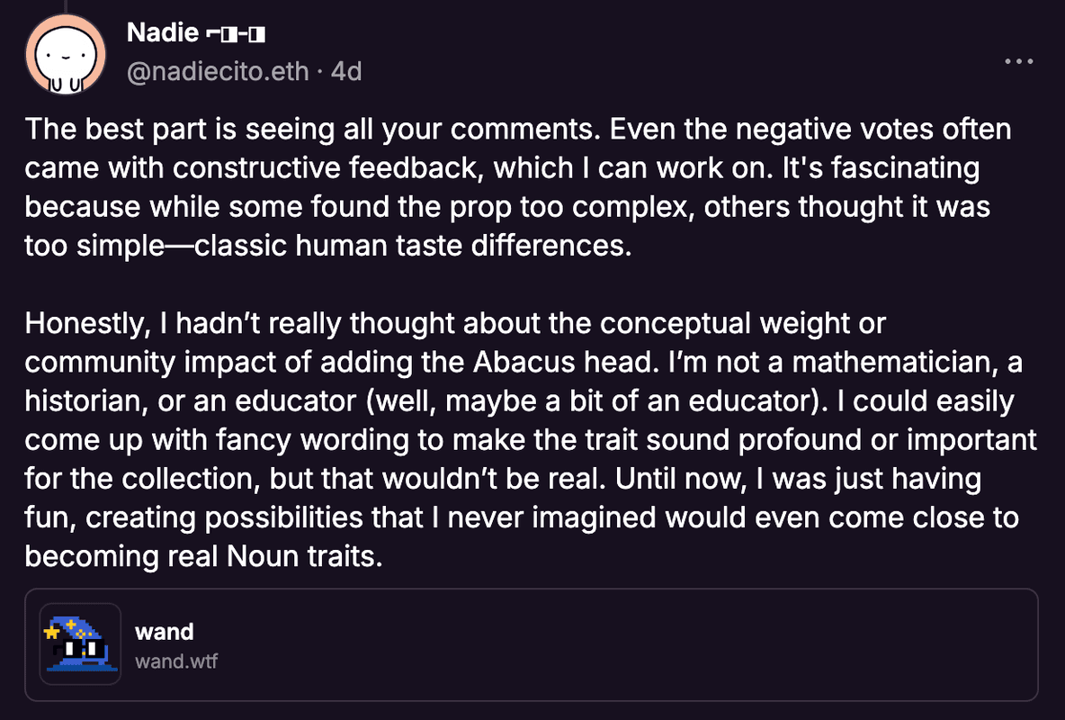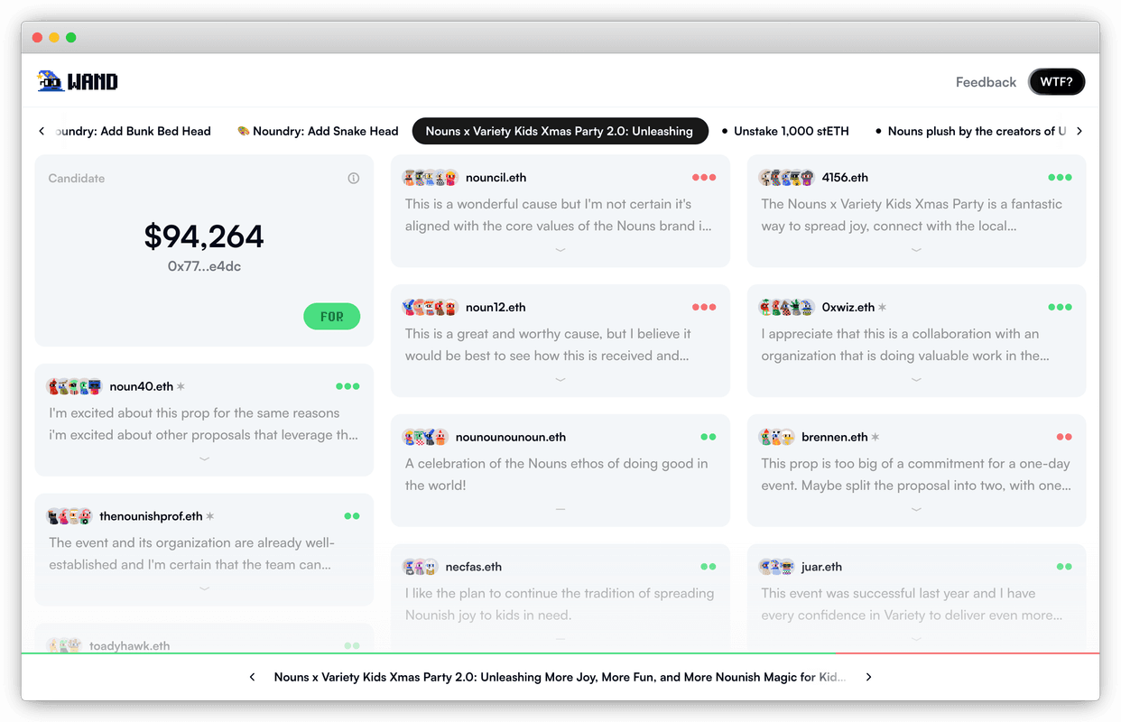 Proposal #643 introduced a functional prototype of Wand that showcased its ability to predict proposal outcomes by simulating the votes of active community members. This addresses a significant challenge of proposing an idea to Nouns — the lack of a reliable way to gauge community sentiment and receive feedback on proposals before going onchain.