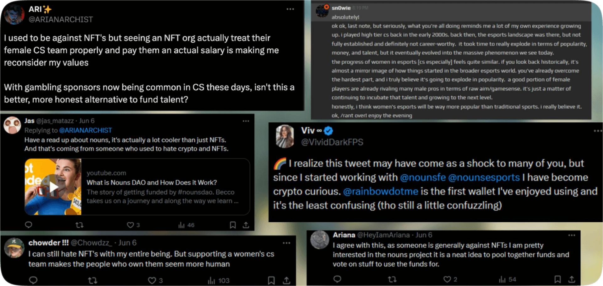 Nouns CS2 and (more recently) nouns.fe have proudly competed as staples in the NA Counter-Strike scene, seeking to cement our place at the pinnacle of esports while championing the Nounish ethos. As CS2 ushers in a new era, we're doubling down on in-person event attendance and content creation, inflicting proven, powerful sentiment shifts where conversion to super-fans is high.