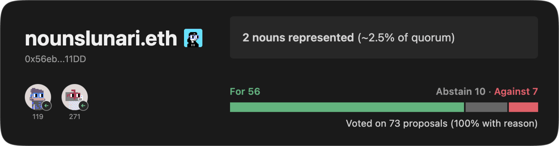 Since our delegation of Noun 117 and 271, we have voted on a total of 72 proposals with 100% VWR rate!