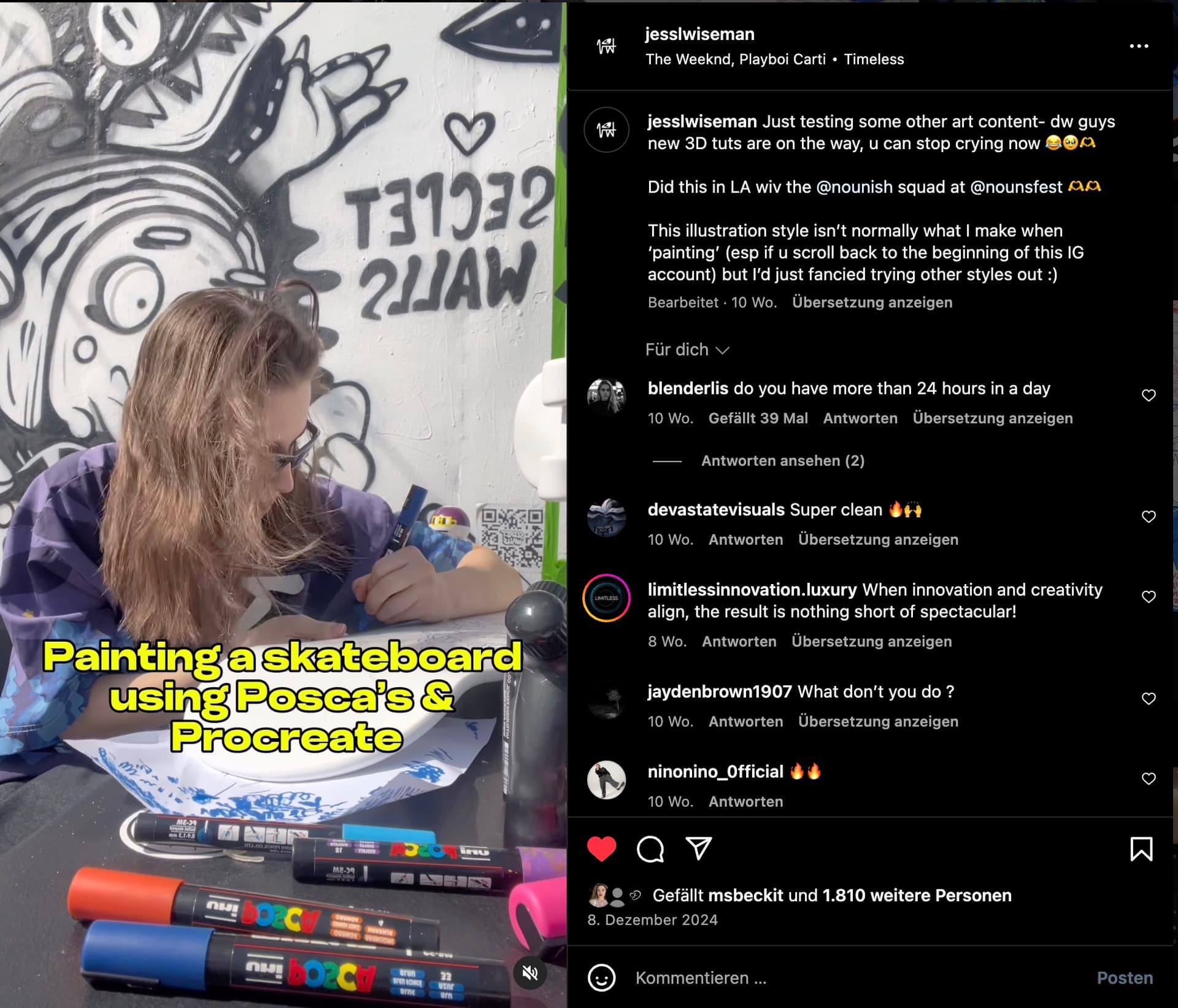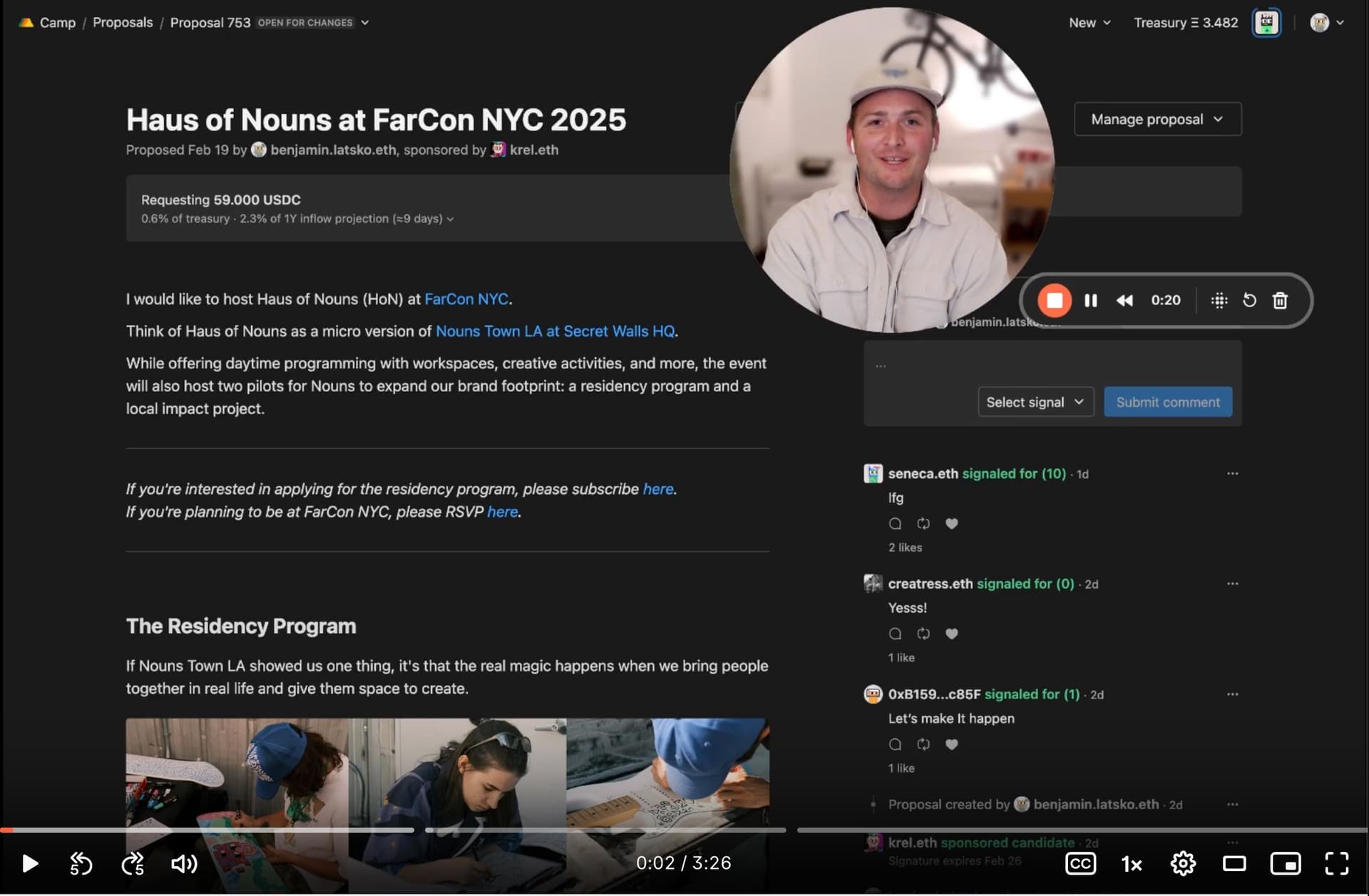 For Nouns Town 24, I did an experiment which tested positive. Goldy + team gently promoted the activation on their channels and it attracted 72 talented artist who were keen to engage with the brand (one way or another). As a result we sponsored top talent Jess Wisemann to spend the week with us in LA and make art. She has been repeatidly engaging with Nouns and we're in the process of - well, "BD'ing" what it could look like in the future.